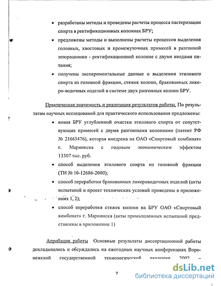 новая БРУ углубленной очистки этилового спирта от сопутствующих примесей с двумя разгонными колоннами (патент РФ № 21663476), которая внедрена на ОАО «Спиртовый комбинат» г. Мариинска с годовым экономическим эффектом 13307 тыс. руб.