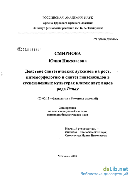 Цель и задачи исследования. Цель настоящей работы состояла в изучении влияния типа синтетического ауксина на процессы роста, цитофизиологические и цитогенетические характеристики, биосинтез гинзенозидов в культуре клеток растений двух видов рода Panax: P. japonicus var. repens С.А. Meyer и P. ginseng С.А. Meyer.