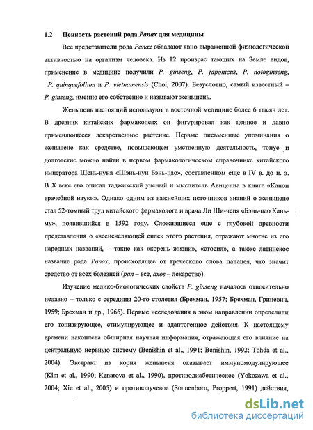 Изучение медико-биологических свойств P. ginseng началось относительно недавно - только с середины 20-го столетия (Брехман, 1957; Брехман, Гриневич, 1959; Брехман и др., 1966). Первые исследования в этом направлении определили его тонизирующее, стимулирующее и адаптогенное действия. К настоящему времени накоплена обширная научная информация, отражающая его влияние на центральную нервную систему (Benishin et al., 1991; Benishin, 1992; Tohda et al., 2004). Экстракт из корня женьшеня оказывает иммуномодулирующее (Kim et al, 1990; Kenarova et al., 1990), противодиабетическое (Yokozawa et al., 2004; Xie et al., 2005) и противолучевое (Sonnenborn, Proppert, 1991) действия, улучшает кровоснабжение мозга, увеличивает потребление кислорода, активизирует кроветворение (Lee, 1992), стимулирует синтез РНК и ДНК (Cho et al., 1995). В научной литературе имеются сообщения об антиоксидантной активности P. ginseng (Han et al., 1985; Zhang et al., 1996a; Keum et al., 2000; Kim et al., 2002; Liu et al., 2003; Kang et al, 2006).