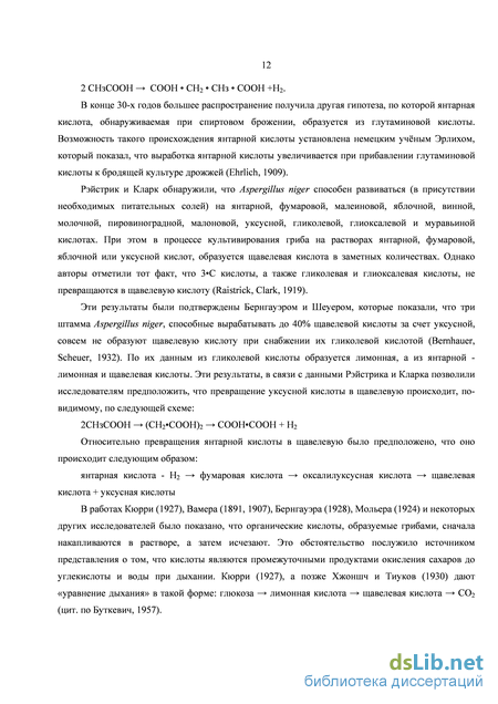 Эти результаты были подтверждены Бернгауэром и Шеуером, которые показали, что три штамма Aspergillus niger, способные вырабатывать до 40% щавелевой кислоты за счет уксусной, совсем не образуют щавелевую кислоту при снабжении их гликолевой кислотой (Bernhauer, Scheuer, 1932). По их данным из гликолевой кислоты образуется лимонная, а из янтарной -лимонная и щавелевая кислоты. Эти результаты, в связи с данными Рэйстрика и Кларка позволили исследователям предположить, что превращение уксусной кислоты в щавелевую происходит, по-видимому, по следующей схеме: