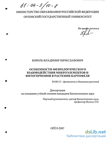 - Влияние микроэлементов и регуляторов роста на процесс дыхания прорастающих клубней