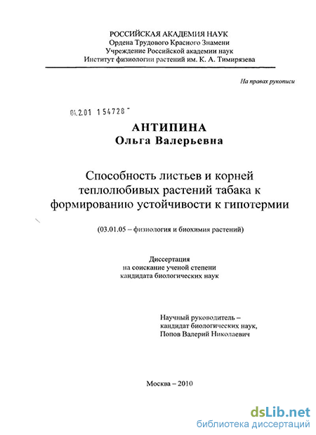 Процессы формирования низкотемпературной устойчивости наиболее полно изучены на растениях, относящихся к группе морозостойких. Теплолюбивые растения, в частности табак, в этом отношении менее изучены (Балагурова и др., 2001; Ти-