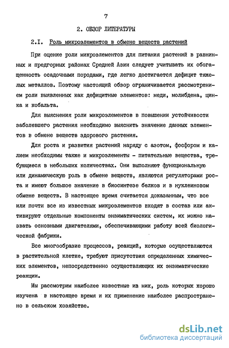 Известно, что ряд элементов (калий, цинк, молибден, кобальт и медь) способны действовать, снижая вредоносность вертициллез-ного и фузариозного вилтов, однако механизмы их действия не во всех случаях известны, а круг их может быть расширен. Особенно мало известен механизм действия микроэлементов в отношении верти-циллезного вилта средневолокнистого хлопчатника. Расширение наших знаний о роли компонентов минерального питания позволит найти комплексные меры борьбы с этим заболеванием. Однако, до настоящего времени в целях изыскания средств поддержки природной устойчивости селекционируемых сортов хлопчатника к заболеванию вил-том, которая: как выяснилось, находится в тесной связи с типом и минеральными компонентами почвы (Беккер З.Э., Чадова Ж.С, 1971; Беккер З.Э., Рабочев И.С., Лихачева Л.Н. и др., 1977), использовались только два пути. Путь эмпирических проб различных микроэлементов был использован в работах С.А. Аскаровой и Р.Я. Иоффе (1962, 1964), обнаруживших снижение вертициллезного вилта хлопчатника под влиянием микроэлементов, в особенности кобальта, и путь аналогий с более фундаментально изученными болезнями увядания, как фузариозное увядание томатов и льна ( Gaumann В., 1951, 1958; Kluepfel D., 1957; Дунин М.С.,Младенов М.Р., 1968), был применен в работах под руководством З.Э. Беккер по фузариозному вилту хлопчатника (Беккер З.Э., Полетаева В.Ф., 1971; Kalyana-sundaram R., Saroswati-Devi L., 1955).