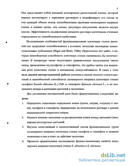 Исследованию особенностей функционирования клеточных стенок растений как природных ионообменников в условиях засоления посвящены немногочисленные публикации (Bigot and Binet, 1986). Практически нет работ, в которых ионообменная способность клеточных стенок оценивалась бы количественно. В литературе также отсутствуют сравнительные исследования такого плана, проведенные на.галофитах и гликофитах, что крайне важно для выявления роли клеточных стенок в механизмах солеустойчивости. В связи с этим цель данной диссертационной работы состояла в оценке ионного статуса растений и ионообменной способности полимерного матрикса клеточных стенок галофита Suaeda altissima (L.) Pall, и гликофита Spinacia oleracea L., и их возможного вклада в адаптацию растений к засолению.