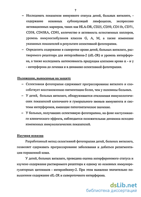Изучение пропорций клеток, экспрессирующих маркеры CD38, CD45RA, CD50, CD95, CDllb, CD71, активности естественных киллеров (ЕК-клетки), уровня растворимого рецептора для интерлейкина -2 (sIL-2R), оценки интерфе-ронового статуса у детей, больных витилиго, в процессе СФТ ранее не проводилось.