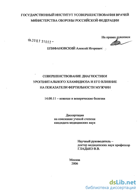 Одной из причин противоречивости данных о влиянии хламидийной инфекция на параметры спермиологического обследования (Witkin S. et aL, 1995; Wolff H. et al., 1994; Братина Е.Е. 2001) может быть нечеткость при выборе адекватных методов диагностики персистирующей инфекции и инфицирования верхних отделов мочеполового тракта мужчин.