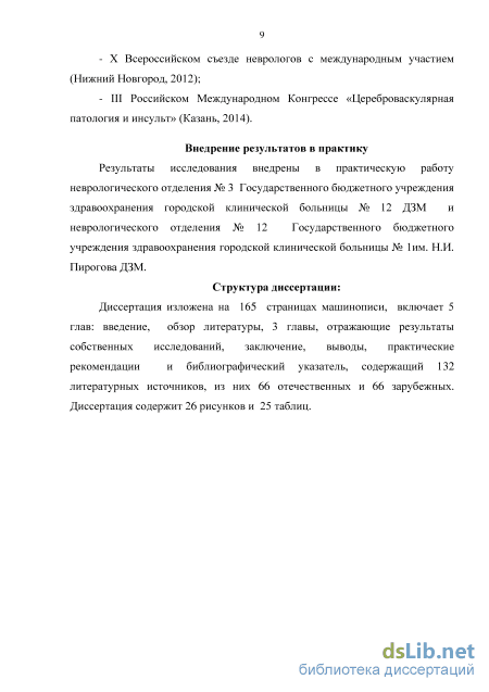Материалы диссертации доложены и обсуждены на объединенной научно-практической конференции сотрудников кафедры неврологии, нейрохирургии и медицинской генетики лечебного факультета и НИЛ Сосудистых заболеваний головного мозга ГБОУ ВПО РНИМУ им. Н.И.Пирогова Минздрава РФ, сотрудников кафедры неврологии ФДПО ГБОУ ВПО РНИМУ им. Н.И.Пирогова Минздрава РФ, сотрудников кафедры неврологии ГБОУ ДПО РМАПО и сотрудников 12 и 13 неврологических отделений ГБУЗ ГКБ № 1им. Н.И. Пирогова ДЗ г. Москвы 28 апреля 2015 г., протокол № 34.
