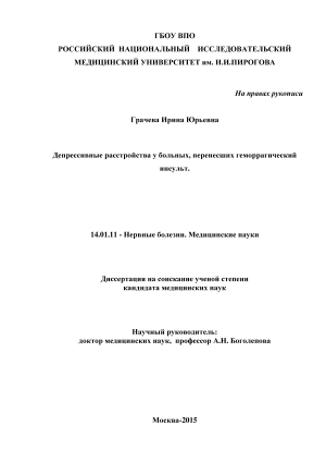 геморрагического инсульта, а также тяжести неврологических расстройств у больных с геморрагическим инсультом на частоту развития депрессивных расстройств. Также описаны клинические особенности депрессивных расстройств у пациентов, перенесших геморрагический инсульт. Область диссертационного исследования Грачевой Ирины Юрьевны соответствует п. № 3 - сосудистые заболевания нервной системы, п. № 19 - нейровизуализационные и инструментальные методы исследования в неврологии, п. № 20 -лечение неврологических больных и нейрореабилитация Паспорта специальности 14.01.11 - Нервные болезни. Медицинские науки.