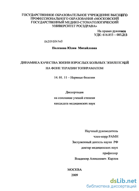 Паленова Юлия Михайловна. Динамика качества жизни взрослых больных эпилепсией на фоне терапии топираматом : диссертация ... кандидата медицинских наук : 14.01.11 / Паленова Юлия Михайловна; [Место защиты: ГОУВПО "Московский государственный медико-стоматологический университет"].- Москва, 2010.- 145 с.: ил.