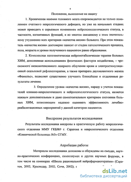 Патогенетически обосновано и в клинических условиях успешно апробировано сочетанное проведение нейрофармако- и физиотерапии (чрескожного низкоинтенсивного лазерного облучения крови и электростимуляционной скальповой рефлексотерапии). Впервые дано обоснование включению в лечебный процесс у больных ХИМ препарата двухвалентного железа «Фенюльс» в профилактической, а при необходимости, - и в лечебной дозировке.