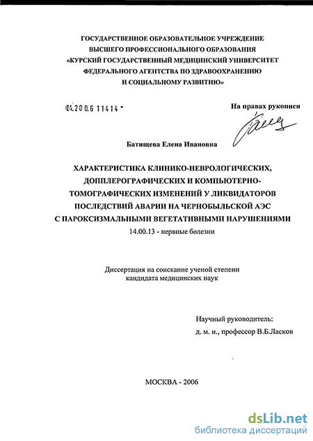 Батищева Елена Ивановна. Характеристика клинико-неврологических, доплерографических и компьютерно-томографических изменений у ликвидаторов последствий аварии на Чернобыльской АЭС с пароксизмальными вегетативными нарушениями : диссертация ... кандидата медицинских наук : 14.00.13 / Батищева Елена Ивановна; [Место защиты: ГОУВПО "Российский университет дружбы народов"].- Москва, 2006.- 130 с.: ил.