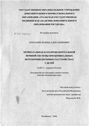 Плеханов Леонид Александрович. Перинатальная патология центральной нервной системы при цервикальных вертебромиелогенных расстройствах у детей : диссертация ... доктора медицинских наук : 14.00.13 / Плеханов Леонид Александрович; [Место защиты: ГОУВПО "Уральская государственная медицинская академия"].- Екатеринбург, 2006.- 0 с.: ил.