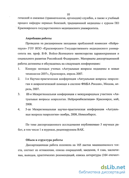 Работа выполнена на кафедре нервных болезней ГОУ ВПО «Красноярский Государственный медицинский университет им. проф. В.Ф. Войно-Ясенецкого министерства здравоохранения и социального развития Российской Федерации», на базе ФГУЗ Клиническая больница № 42 (г. Зеленогорск). Основные результаты проведенной работы внедрены в клиническую практику Клинической больницы № 42, г. Зеленогорска, ФМБА России, в неврологической и смежных (травматология, ортопедия) службах, а также в учебный процесс кафедры нервных болезней, традиционной медицины с курсом ПО Красноярского государственного медицинского университета.