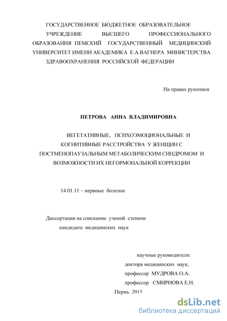 ГЛАВА 1. Постменопаузальный метаболический синдром и функции нервной системы: современное состояние проблемы (обзор литературы)
