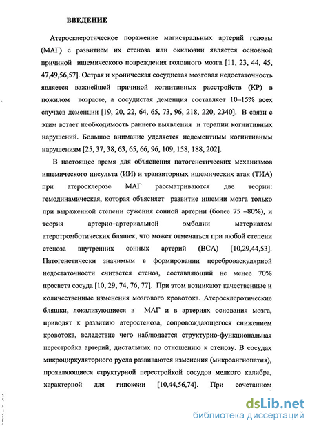 Атеросклеротическое поражение магистральных артерий головы (МАГ) с развитием их стеноза или окклюзии является основной причиной ишемического повреждения головного мозга [Виленский Б.С., 2005, Дамулин И.В., 2005, Кадыков А.С., 2006 и др.]. Острая и хроническая сосудистая мозговая недостаточность является важнейшей причиной когнитивных нарушений в пожилом возрасте, а сосудистая деменция составляет 10–15% всех случаев деменции [Дамулин И.В., 2008, Яхно Н.Н., 2006 с соавт., и др.]. В связи с этим встает необходимость раннего выявления и терапии когнитивных расстройств. Большое внимание уделяется недементным когнитивным расстройствам [Дамулин И.В., 2004, Захаров В.В., 2005, Яхно Н.Н., 2006 с соавт., Левин О.С., 2007 и др.]. В настоящее время для объяснения патогенетических механизмов ишемического инсульта (ИИ) и транзиторных ишемических атак (ТИА) при атеросклерозе МАГ рассматриваются две теории: гемодинамическая, которая объясняет развитие ишемии мозга только при выраженной степени сужения сонной артерии (более 75 –80%), и теория артерио–артериальной эмболии материалом атеротромботических бляшек, что может отмечаться при любой степени стеноза внутренних сонных артерий (ВСА) [Верещагин Н.В., 1997, Куперберг Е.Б., 1997, Жулев Н.М., 2004, Кадыков А.С., 2006 и др.].