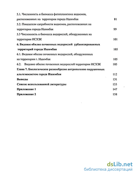 Научная новизна. Составлен систематический список водорослей водных и наземных урбанизированных экосистем г. Ишимбая, что позволяет расширить общий список водорослей антропогенно нарушенных территорий средней полосы Европы. Проведено экологическое картирование по количественным показателям альгоценозов. Впервые для оценки степени антропогенной нарушенности водных и почвенных альгоценозов используется комплекс индексов, характеризующих а, р" и у- разнообразие.