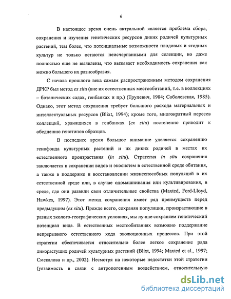 В последнее время большое внимание уделяется сохранению генофонда культурных растений и их диких родичей в местах их естественного произрастания (in situ). Стратегия in situ сохранения заключается в сохранении видов и экосистем в естественной среде обитания, а также в поддержке и восстановлении жизнеспособных популяций в их естественной среде или, в случае одомашнивания или культивирования, в среде, где они развили свои отличительные свойства (Maxted, Ford-Lloyd, Hawkes, 1997). Этот метод сохранения имеет ряд преимуществ перед предыдущим (ex situ). Прежде всего, сохраняя популяции, произрастающие в разных эколого-географических условиях, мы лучше сохраняем генетический потенциал вида. В естественных местообитаниях возможно поддержание непрерывного естественного хода эволюционных процессов. При этой стратегии обеспечивается относительно более легкое сохранение ряда дикорастущих родичей культурных растений (Blixt, 1994; Maxted et al., 1997; Смекалова и др., 2002). Несмотря на некоторые недостатки этой стратегии (уязвимость в связи с антропогенным воздействием, относительную труднодоступность и неоперативность в получении материала и некоторые другие), сохранение in situ рассматривается учеными разных стран в качестве приоритетного метода сохранения генетических ресурсов диких родичей культурных растений (Plant genetic conservation (the in situ approach), 1997; Forest genetic resources..., 2001 и др.). Тем не менее, обе стратегии сохранения (ex situ и in situ) связаны, дополняют друг друга и могут быть использованы в совокупности (Смекалова и др., 2000, 2001, 2002).