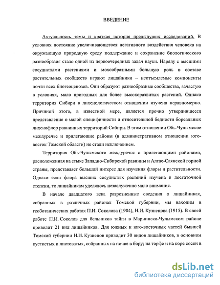 Актуальность темы и краткая история предыдущих исследований. В условиях постоянно увеличивающегося негативного воздействия человека на окружающую природную среду поддержание и сохранение биологического разнообразия стало одной из первоочередных задач науки. Наряду с высшими сосудистыми растениями и мохообразными большую роль в составе растительных сообществ играют лишайники - неотъемлемые компоненты почти всех биогеоценозов. Они образуют разнообразные сообщества, зачастую в условиях, мало пригодных для более высокоразвитых растений. Однако территория Сибири в лихенологическом отношении изучена неравномерно. Причиной этого, в известной мере, является прочно утвердившееся представление о малой специфичности и относительной бедности бореальных лихенофлор равнинных территорий Сибири. В этом отношении Обь-Чулымское междуречье и прилегающие районы (в административном отношении юго-восток Томской области) не стали исключением.
