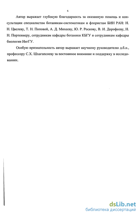 Автор выражает глубокую благодарность за оказанную помощь и консультации специалистам ботаникам-систематикам и флористам БИН РАН: Н. Н. Цвелеву, Т. Н. Поповой, А. Д. Михееву, Ю. Р. Роскову, В. И. Дорофееву, Н. Н. Портениеру, сотрудникам кафедры ботаники КБГУ и сотрудникам кафедры биологии ИнгГУ.
