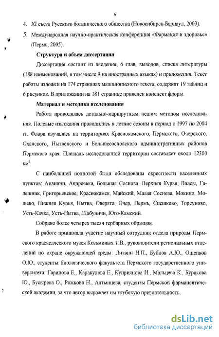 Работа проводилась детально-маршрутным пешим методом исследования. Полевые изыскания проводились в летние сезоны в период с 1997 по 2004 гг. Флора изучалась на территориях Краснокамского, Пермского, Очерского, Оханского, Нытвенского и Большесосновского административных районов Пермского края. Площадь исследованной территории составляет около 12300 км2.