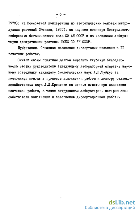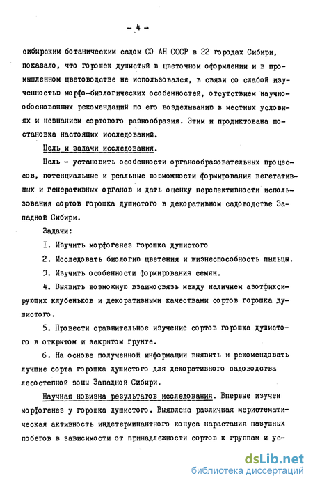 Цель - установить особенности органообразоватедьных процессов, потенциальные и реальные возможности формирования вегетативных и генеративных органов и дать оценку перспективности использования сортов горошка душистого в декоративном садоводстве Западной Сибири. Задачи: 1. Изучить морфогенез горошка душистого 2. Исследовать биологию цветения и жизнеспособность пыльцы. 3. Изучить особенности формирования семян. 4. Выявить возможную взаимосвязь между наличием азотфикси-рующих клубеньков и декоративными качествами сортов горошка душистого . 5. Провести сравнительное изучение сортов горшка душистого в открытом и закрытом грунте. 6. На основе полученной информации выявить и рекомендовать лучшие сорта горшка душистого для декоративного садоводства лесостепной зоны Западной Сибири. Научная новизна результатов исследования. Впервые изучен морфогенез у горшка душистого. Выявлена различная меристемати-ческая активность индетерминантного конуса нарастания пазушных побегов в зависимости от принадлежности сортов к группам и условий их культуры. Получены новые материалы по корреляции между количеством на корнях азотфиксирующих клубеньков и декоративными качествами растений горошка душистого. Установлена реальная возможность интродукции горшка душистого в условиях лесостепной зоны Западной Сибири. Практическая ценность работы. Данные по морфогенезу горошка душистого служат научной основой возделывания его в новых условиях произрастания. Разработан метод, ускоряющий прорастание семян. Из изученных 160 образцов (138 сортов) отобрано и рекомендовано 29 сортов, перспективных для создания цветочных композиций, вертикального озеленения и на срез. Впервые в Сибири доказана возможность возделывания горошка душистого в закрытом грунте в зимне-весеннее время с выходом цветочной продукции до 1100 шт. с I кг. За внедрение сортов горошка душистого автор награжден Бронзовой медалью ВДНХ. 1и сортов переданы в совхоз ..Цветы Сибири" (г. Новосибирск) и Кемеровский цветоводческий совхоз. Апробация работы. Результаты исследований доложены на научно-практической конференции: .Достижения науки и передовой практики садоводства - производству" (Новосибирск, 1969); на Всесоюзном совещании по проблемам зеленого строительства и садово-паркового хозяйства (Новосибирск, 1972); на первой межобластной научно-практической конференции по озеленению гордов и других населенных пунктов Сибири (Барнаул, 1971); на Всесоюзном совещании по прблемам рста и развития растений в условиях интрдукции (Москва, 1973); на юбилейной сессии Центрального сибирского ботанического сада СО АН СССР, посвященной 250-летию Академии наук СССР (Новосибирск, 1975); на Выставке достижений нардного хозяйства в павильоне ..Цветоводство и озеленение" (Москва, 1976, 1978); на Всесоюзной конференции по теоретическим основам интр-дукции растений (Москва, 1983); на научном семинаре Центрального сибирского ботанического сада СО АН СССР и на заседании лаборатории декоративных растений ЦСБС СО АН СССР. Публикации. Основные положения диссертации изложены в П печатных работах. Считаю своим приятным долгом выразить глубокую благодарность своему руководителю заведующему лабораторией старшему научному сотруднику кандидату биологических наук Л.П.Зубкус за постоянную помощь в процессе выполнения работы