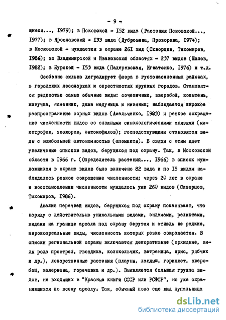 Особенно сильно деградирует флора в густонаселенных районах, в городских лесопарках и окреотноотях крупных городов. Становятся редкоотью самые обычные виды: сочевичний, зверобой, копытень, живучка, ясменник, даже медуница и нивяник; наблюдается широкое распространение сорных видов (Аиельченко, 1983) и резкое сокращение численности видов со сложными синэкологичеокими связями (ми-котрофов, зоохоров, энтомофилов); господствующими становятся виды с наибольшей автономностью (апомикты). В связи с этим идет увеличение списков видов, берущихоя под охрану. Так, в Московской области в 1966 г. (Определитель растений..., 1966) в список нуждающихся в охране видов было включено 82 вида и по 15 видам наблюдалось резкое сокращение численности; через 20 лет в охране и восстановлении численности нуждалось уже 260 видов (Скворцов, Тихомиров, 1986).