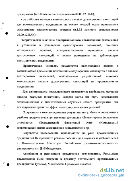 Практическая ценность результатов исследования связана с возможностью применения положений международных стандартов в анализе долгосрочных инвестиций, использования разработанной методики комплексного анализа долгосрочных инвестиций на промышленном предприятии.