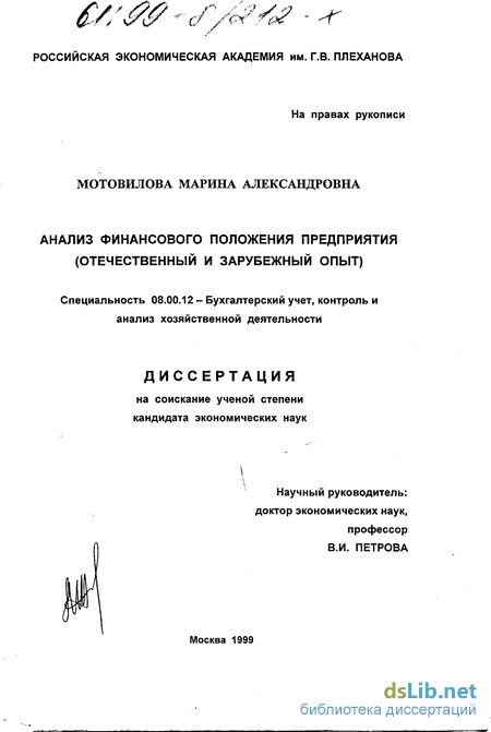 Предмет и объект исследования. Предметом исследования явились теория, методология и практика анализа финансового положения предприятия в условиях рыночной экономики. Объектом исследования избраны национальные и зарубежные методики финансового анализа. Объектом практической реализации результатов исследования явились Межотраслевой институт повышения квалификации и переподготовки руководящих кадров и специалистов Российской экономической академии им. Г.В. Плеханова (МИПК РЭА), НПО «Наука»,
