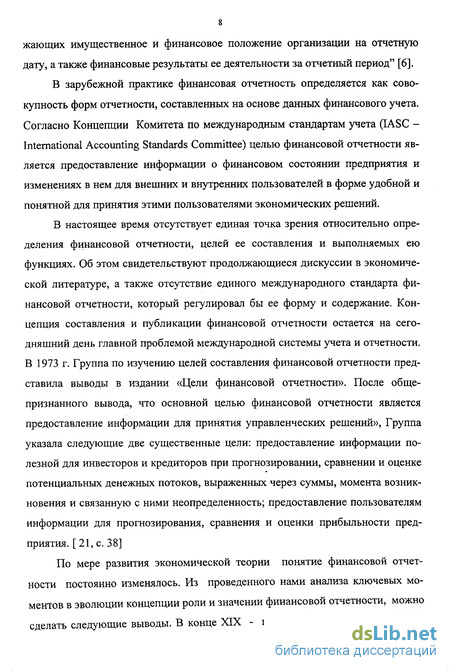В зарубежной практике финансовая отчетность определяется как совокупность форм отчетности, составленных на основе данных финансового учета. Согласно Концепции Комитета по международным стандартам учета (IASC -International Accounting Standards Committee) целью финансовой отчетности является предоставление информации о финансовом состоянии предприятия и изменениях в нем для внешних и внутренних пользователей в форме удобной и понятной для принятия этими пользователями экономических решений.