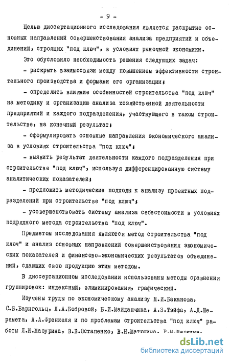 Изучены труды по экономическому анализу М.И.Баканова» С.Б.Барнгольц» Л.А.Бобровой, Б.И.Майданчика, А.З.Тэйфа, А.Д.Шеремета» А.А.Френкеля и по проблемам строительства "под ключ" работы Л.И.Мазурина» В.В.Остапенко» В.Н.Матюшина» Р.М.Меркина»