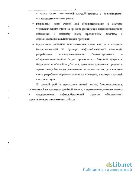 В данной работе предложен новый метод бюджетирования, основанный на принципе двойной записи, и применение данного метода к предприятиям нефтедобывающей отрасли обеспечивает практическую значимость работы.