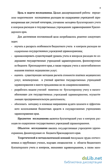 s Цель и задачи исследования. Целью диссертационной работы определено теоретическое исследование расходов по содержанию учреждений здравоохранения как учетной категории, уточнение методики бухгалтерского учета и контроля расходов в государственных учреждениях здравоохранения Краснодарского края.