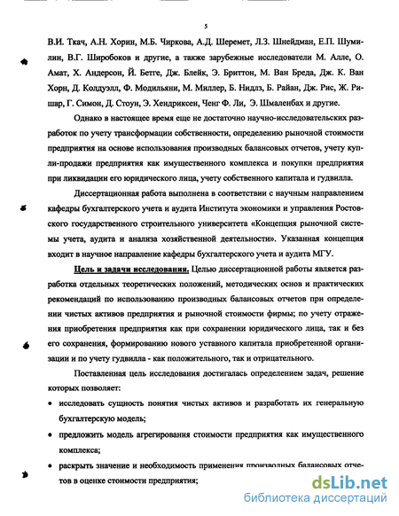 Цель и задачи исследования. Целью диссертационной работы является разработка отдельных теоретических положений, методических основ и практических рекомендаций по использованию производных балансовых отчетов при определении чистых активов предприятия и рыночной стоимости фирмы; по учету отражения приобретения предприятия как при сохранении юридического лица, так и без его сохранения, формированию нового уставного капитала приобретенной организации и по учету гудвилла - как положительного, так и отрицательного.