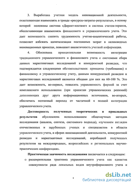 Необходимость рассмотрения места, целей и задач управленческого учета, обоснование выбора метода учета затрат на инновационную деятельность, а также повышение аналитических возможностей посредствам расширения объектов управленческого учета определили выбор темы диссертационного исследования, ее цель и задачи, объекты и методы, а также направления использования результатов.
