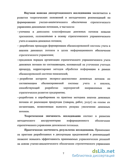 Научная новизна диссертационного исследования заключается в развитии теоретических положений и методических рекомендаций по формированию учетно-аналитического обеспечения стратегического управления денежными потоками, в частности: -уточнена и дополнена классификация денежных потоков новыми