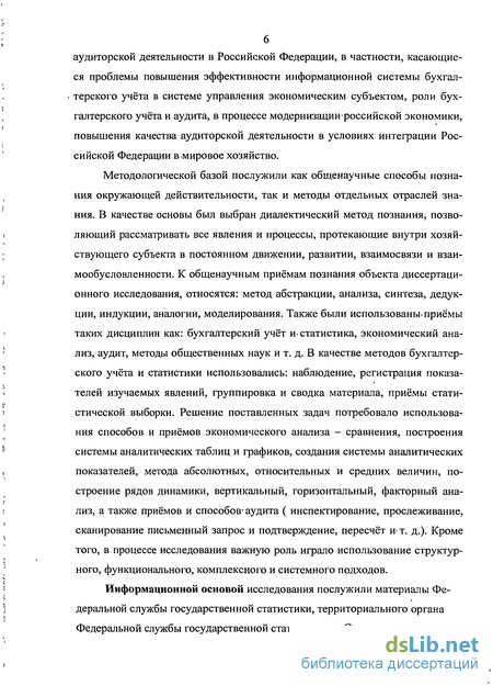 Методологической базой послужили как общенаучные способы познания окружающей действительности, так и методы отдельных отраслей знания. В качестве основы был выбран диалектический метод познания, позволяющий рассматривать все явления и процессы, протекающие внутри хозяйствующего субъекта в постоянном движении, развитии, взаимосвязи и взаимообусловленности. К общенаучным приёмам познания объекта диссертационного исследования, относятся: метод абстракции, анализа, синтеза, дедукции, индукции, аналогии, моделирования. Также были использованьь приёмы таких дисциплин как: бухгалтерский учёт и» статистика, экономический анализ, аудит, методы общественных наук и т. д. В качестве методов бухгалтерского учёта и статистики использовались: наблюдение, регистрация показателей изучаемых явлений, группировка и сводка материала, приёмы статистической выборки. Решение поставленных задач потребовало использования способов и приёмов экономического анализа — сравнения, построения системы аналитических таблиц и графиков, создания системы аналитических показателей, метода абсолютных, относительных и средних величин, построение рядов динамики, вертикальный, горизонтальный, факторный анализ, а также приёмов и способов* аудита ( инспектирование, прослеживание, сканирование письменный запрос и подтверждение, пересчёт и* т. д.). Кроме того, в процессе исследования важную роль играло использование структурного, функционального, комплексного и системного подходов.