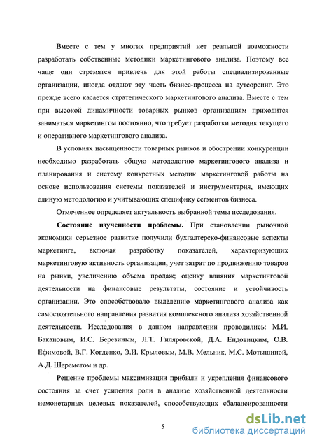 При становлении рыночной экономики серьезное развитие получили бухгалтерско-финансовые аспекты маркетинга, включая разработку показателей, характеризующих маркетинговую активность организации, учет затрат по продвижению товаров на рынки, увеличению объема продаж; оценку влияния маркетинговой деятельности на финансовые результаты, состояние и устойчивость организации. Это способствовало развитию теории, методологии и практики маркетингового анализа как самостоятельного направления развития комплексного анализа хозяйственной деятельности. Исследования в данном направлении проводились: М.И. Бакановым, И.С. Березиным, Л.Т. Гиляровской, Д.А. Ендовицким, О.В. Ефимовой, В.Г. Когденко, Э.И. Крыловым, М.В. Мельник, М.С. Мотышиной, А.Д. Шереметом и др.