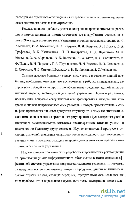 Отдавая должное большому вкладу этих ученых в решение данной проблемы, необходимо отметить, что исследования в работах вышеназванных ав І торов носят общий характер, что не обеспечивает создания единой интегра ционной модели, необходимой для целей управления. Научные разработки, посвященные вопросам совершенствования формирования информации, контроля и анализа непроизводительных расходов и потерь применительно к специфике производств пищевых продуктов отсутствуют. К тому же систематические изменения в системе нормативного регулирования бухгалтерского учета и налогового законодательства вызывают противоречивые взгляды ученых и практиков по большому кругу вопросов. Научно-технический прогресс в ус ловиях рыночной экономики открывает новые возможности для совершенст вования учета и контроля расходов непроизводительного характера как самостоятельного объекта управления.