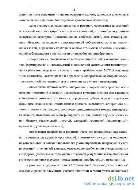 - определены направления развития учета консолидированного основного капитала для крупных организаций: промышленных групп и холдингов; на основе методик консолидированного учета определены направления учета инвестиций в основной капитал, отвечающие требованиям международных стандартов; уточнены методы оценки "деловой репутации" в зависимости от стоимости покупки и суммы чистых активов приобретаемого предприятия;