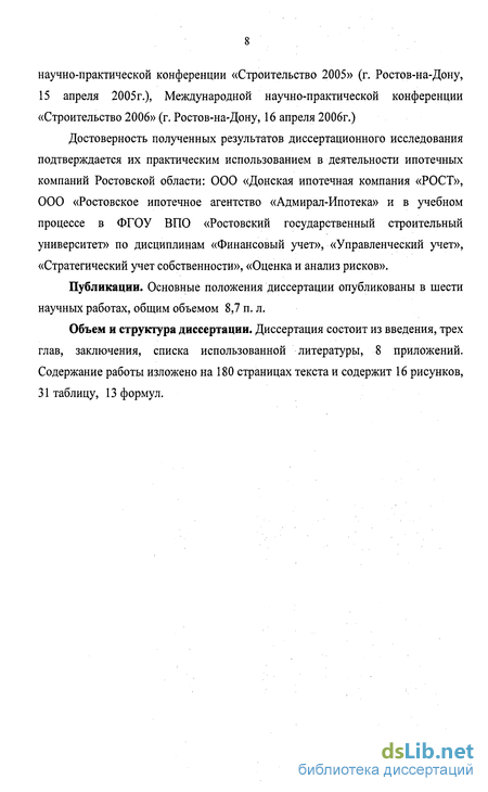 Достоверность полученных результатов диссертационного исследования подтверждается их практическим использованием в деятельности ипотечных компаний Ростовской области: ООО «Донская ипотечная компания «РОСТ», ООО «Ростовское ипотечное агентство «Адмирал-Ипотека» и в учебном процессе в ФГОУ ВПО «Ростовский государственный строительный университет» по дисциплинам «Финансовый учет», «Управленческий учет», «Стратегический учет собственности», «Оценка и анализ рисков».