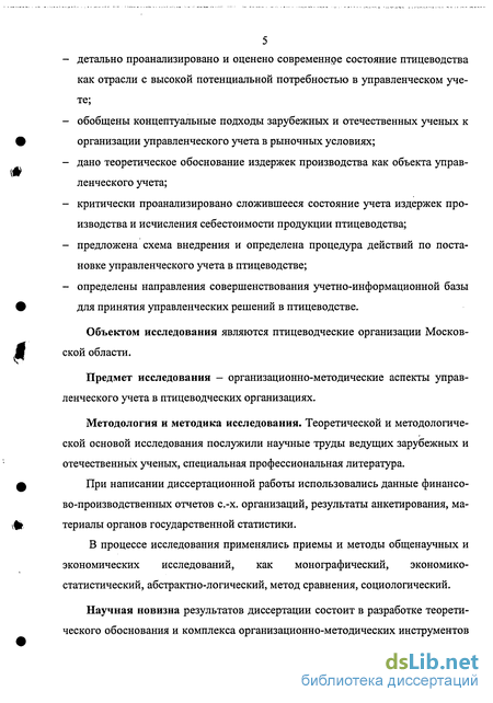 Цель и задачи исследования. Целью диссертационной работы является комплексное изучение и разработка методических вопросов организации управленческого учета в птицеводстве, выявление направлений его совершенствования в современных условиях.