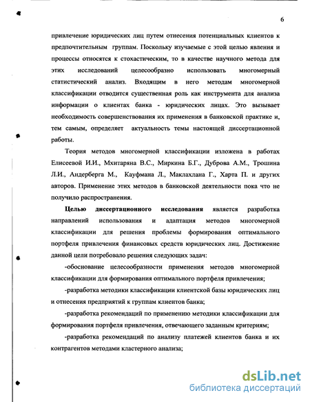 Целью диссертационного исследования является разработка направлений использования и адаптация методов многомерной классификации для решения проблемы формирования оптимального портфеля привлечения финансовых средств юридических лиц. Достижение данной цели потребовало решения следующих задач: