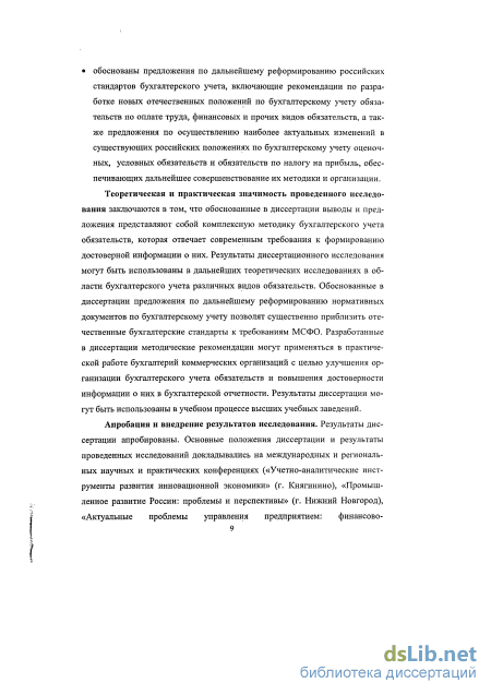 обоснованы предложения по дальнейшему реформированию российских стандартов бухгалтерского учета, включающие рекомендации по разработке новых отечественных положений по бухгалтерскому учету обязательств по оплате труда, финансовых и прочих видов обязательств, а также предложения по осуществлению наиболее актуальных изменений в существующих российских положениях по бухгалтерскому учету оценочных, условных обязательств и обязательств по налогу на прибыль, обеспечивающих дальнейшее совершенствование их методики и организации.