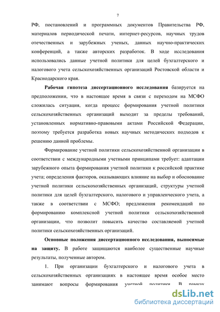 Рабочая гипотеза диссертационного исследования базируется на предположении, что в настоящее время в связи с переходом на МСФО сложилась ситуация, когда процесс формирования учетной политики сельскохозяйственных организаций выходит за пределы требований, установленных нормативно-правовыми актами Российской Федерации, поэтому требуется разработка новых научных методических подходов к решению данной проблемы.