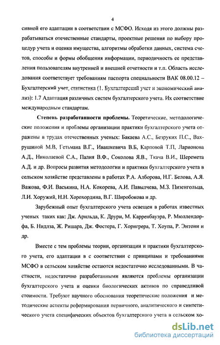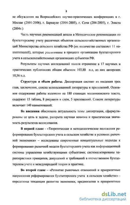 Степень разработанности проблемы. Теоретические, методологические положения и проблемы организации практики бухгалтерского учета отражены в трудах отечественных ученых: Бакаева А.С, Безруких П.С., Бахрушиной М.В, Гетьмана В.Г., Ивашкевича В.Б, Карповой Т.П, Ларионова А.Д., Николаевой С.А., Палия В.Ф., Соколова Я.В., Ткача В.И., Шеремета А.Д. и др. Вопросы развития методологии и практики бухгалтерского учета в сельском хозяйстве представлены в работах Р.А. Алборова, Н.Г. Белова, АЛ. Бажова, Ф.И. Васькина, Н.А. Кокорева, А.И. Павылчева, М.З. Пизенгольца, Л.И. Хоружий, Н.Н. Хорохордина, В.Г. Широбокова и др.