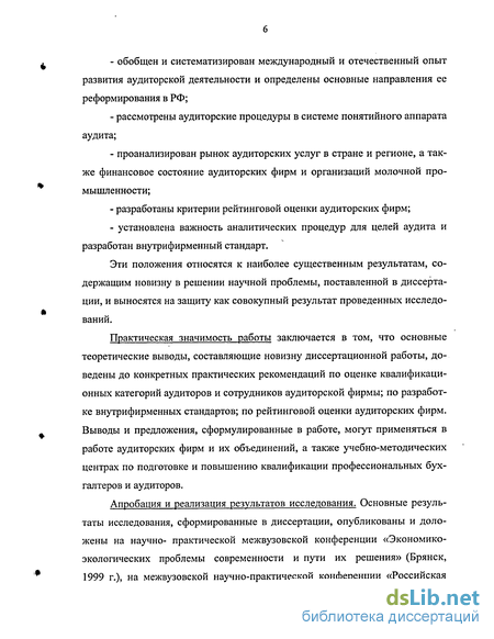 экономика в XXI веке: проблемы, перспективы развития» (Брянск, 2000 г.), на межвузовской практической конференции «Экономика Брянской области: проблемы, перспективы развития» (Брянск, 2001 г.), на межвузовской научно-практической конференции «Экономические и социальные проблемы России XXI века (Брянск, 2002 г.), в межрегиональном сборнике трудов аспирантов и молодых ученых «проблемы социально-экономического развития регионов» (Брянск, 2002 г.) Результаты диссертационного исследования легли в основу для разработки лекционных материалов по учебным курсам «Аудит», «Международные стандарты аудита», который входят в программу обучения студентов экономических специальностей БГСХА (г. Брянск).