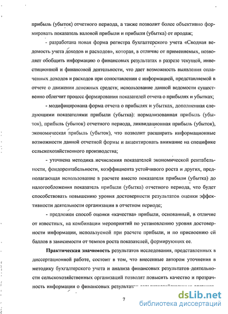 Практическая значимость результатов исследования, представленных в диссертационной работе, состоит в том, что внесенные автором уточнения в методику бухгалтерского учета и анализа финансовых результатов деятельности сельскохозяйственных организаций позволят повысить качество и прозрачность информации о финансовых результатах сельскохозяйственных организа-