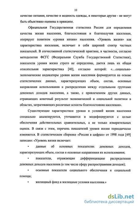 Официальная Государственная статистика России для определения качества жизни населения, благосостояния и благополучия населения, оперирует понятием «уровня жизни» населения. «Уровень жизни» как характеристика населения, включает в себя широкий спектр частных показателей. В отечественной статистической практике, в частности, согласно методологии ФСГС (Федеральная Служба Государственной Статистики), показатели уровня жизни строго не определены, дается лишь их общая описательная характеристика [40], согласно которой: «...социально-экономические индикаторы уровня жизни населения формируются на основе статистических данных, характеризующих объем, состав, основные направления использования и распределения между отдельными группами денежных доходов населения, а также, с привлечением других данных, отражающих конечный результат экономической и социальной политики в областях, затрагивающих различные аспекты благосостояния населения».