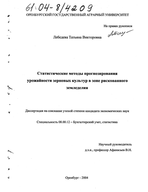Цель и задачи исследования. Целью диссертационной работы является совершенствование методики статистического анализа и прогнозирования урожайности зерновых культур в зоне рискованного земледелия.