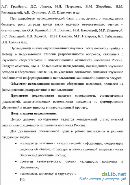 Предметом исследования является совокупность статистических показателей, характеризующих возможности населения по формированию сбережений н включению их в инвестиционный процесс.